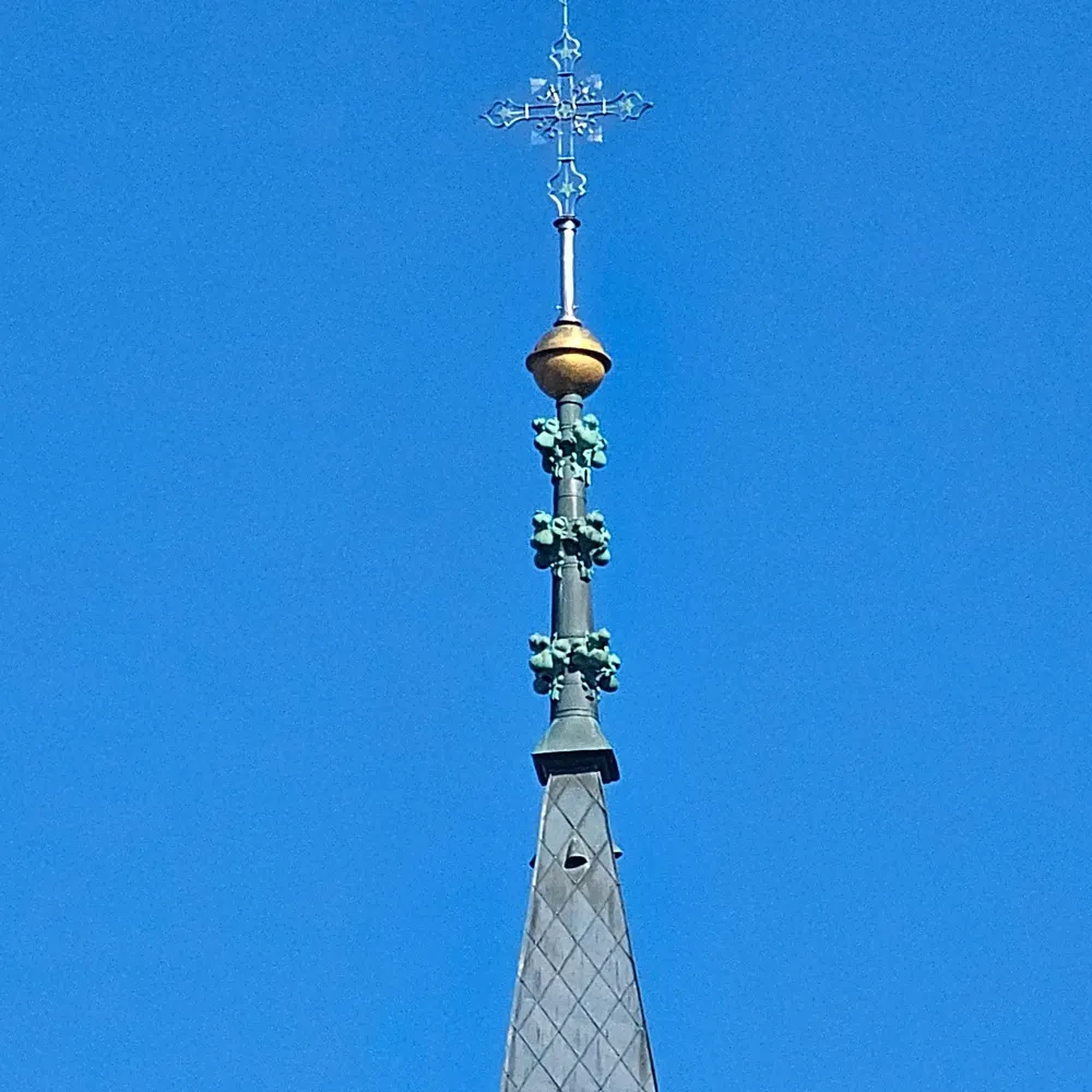 - Posiada strzelistą, pięciokondygnacyjną wieżę, na której wiszą dwa zabytkowe dzwony z XVI wieku.