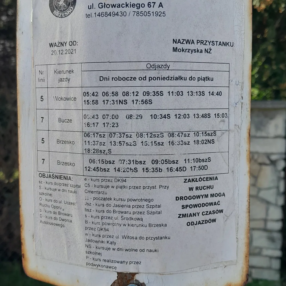 Brzesko DA- 06:16S(Sol2) 06:10(7) 06:17(5) 06:28S(Sol1) 06:34(A5) 06:39DH(MJ) 07:16s(Sol3) 07:21(7) 07:21S(Sol1)08:03Dm(Sol1) 08:16DH(MJ) 08:47(5) 08:56Dm(Sol3) 09:05(7) 09:49DH(MJ) 09:49(A5) 10:03S(Sol1) 10:03qmHsu(Sol1) 10:15S(5) 11:08S(Sol2) 11:10S(7) 11:33qmHsu(Sol1) 11:37(5) 11:51S(Sol1) 11:52DH(MJ)12:21S(Sol1) 12:45(7) 13:13S(Sol1) 13:36qmHsu(Sol2) 13:42DH(MJ) 13:57S(5) 14:01S(Sol2) 14:20S(7) 14:41S(Sol1) 14:50(A5)15:03qmHsu(Sol1) 15:15(5) 15:35(7) 15:57DH(MJ) 16:11S(Sol2)16:33(5) 16:43S(Sol1) 16:45(7) 17:50(7) 18:02NS(5) 18:26DH(MJ) 18:27S(5) 18:31Dm(Sol2) 18:37(A5) 20:59(A5)